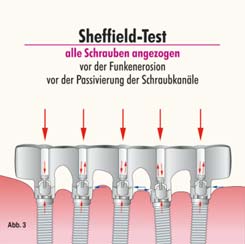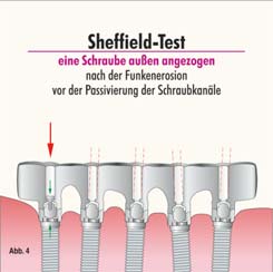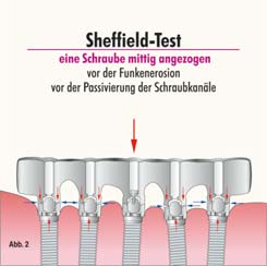 Diese zahntechnisch bedingten Fehlpassungen werden nach Fertigstellung der Suprastruktur durch das Funkenerosionsverfahren korrigiert und ein spannungsfreier Sitz wird erzielt