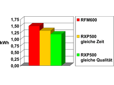 Energie sparen mit Linearmotortechnik Vielfach gelten Linearmotoren als hohe Stromverbraucher. Röders hat jetzt exakt nachgemessen und festgestellt, dass mit moderner Regelungstechnik und auf Grund der geringeren Reibung in den Achsen Maschinen mit Linearmotoren deutlich weniger Strom verbrauchen als vergleichbare Maschinen mit Kugelrollspindelantrieben. Bei exakt gleicher Fräszeit für die Bearbeitung einer typischen Form beträgt die Einsparung des Stromverbrauches der Achsen 12%. Bei gleicher Qualität des Bearbeitungsergebnisses auf Grund der höheren Dynamik der Linearmotorachsen sogar 20%. |